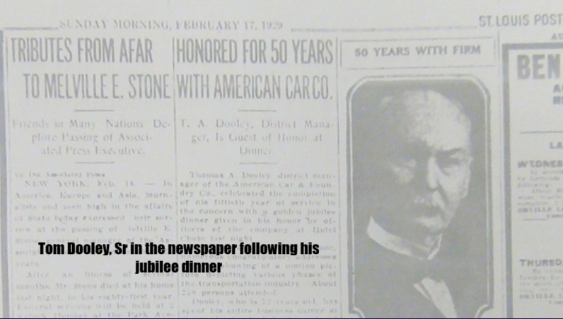 Chapter One: It is a good idea to calculate Thomas A Dooley, Sr’s wealth in simple terms. Envision the railroad making car company Thomas A Dooley built over 50 years at a time when railroad cars sold like hotcakes. The St Louis papers called it one of the largest industrial concerns in St Louis.